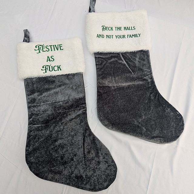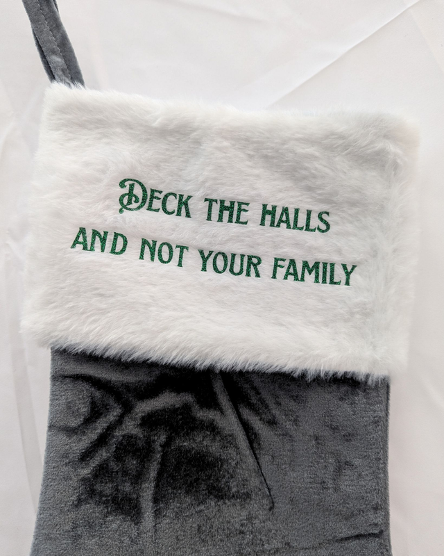 Tired of pretending you’re on Santa’s nice list? Embrace your true chaotic spirit with this stocking — a deliciously dark twist on holiday cheer. Made from plush grey fabric with a white trim, it’s perfect for stuffing coal, cursed candy canes, or questionable life choices. Hang it by the fire and let your guests know that nice is overrated.